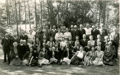 Nog meer namen? In de bovenste rij, vierde vanaf rechts, in overhemd, Hendrik Dijkstra. Tweede vanaf rechts bovenaan: Jo de Haan. Helemaal rechts, staande: de heer Zuiderveld (de vader van Willem Zuiderveld) met schuin voor hem zijn vrouw Hendrikje Zuiderveld-Tempel. In de derde rij van onderen, zittend: o.a. Jan Tempel en zijn vrouw (Hillie Tempel-van der Sluis). Meer in het midden van de foto zitten o.a. Geert Kolk en zijn vrouw en Dirk van der Ploeg met zijn vrouw Nel van der Ploeg-van der Noord (laatstgenoemde was een dochter van koster Piet van der Noord, ook bekend als “Piet Slof”).