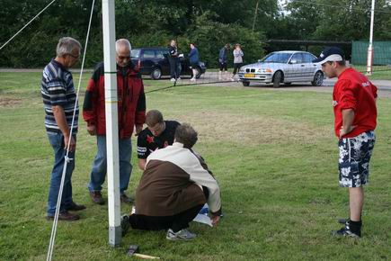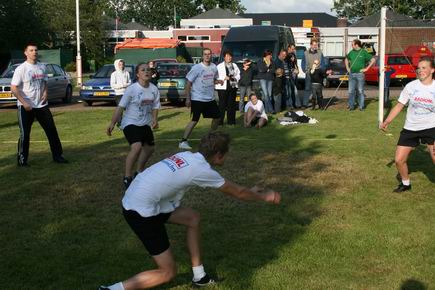 De palen de grond in, het net goed spannen, het veld afbakenen met lint... Het duurt even maar dan kan de sportieve strijd ontbranden!