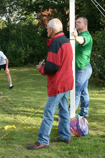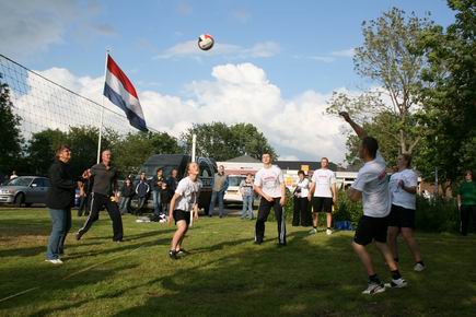 In het verzorgde programmablad (ook bij Albert Heyn etc.) staat als starttijd van het volleybaltoernooi: 18.30 uur. De voorbijvliegende, donkere wolken overdag, waaruit af en toe een fikse hoeveelheid regen valt (“Het is wel even weer genoeg hoor, jongens die daarboven de kranen beheren…”), voorspellen niet veel goeds. Als ik tegen aanvangstijd het voorterrein van de Dörpsstee nader, is een groepje enthousiastelingen een beetje ontmoedigd met de bal aan het ‘klieren’. Hoofdscheidsrechter Hille Dijck is sceptisch over het al of niet doorgaan. “t Vaalt der zo mor weer uut…”
