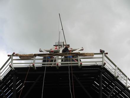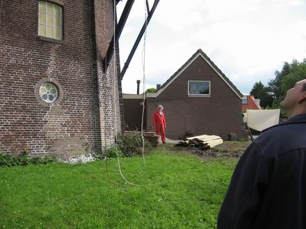 Tja, en dan bevind je je zo maar hangend aan touwen tussen hemel en aarde, en gaat zelfs de hele molen draaien....