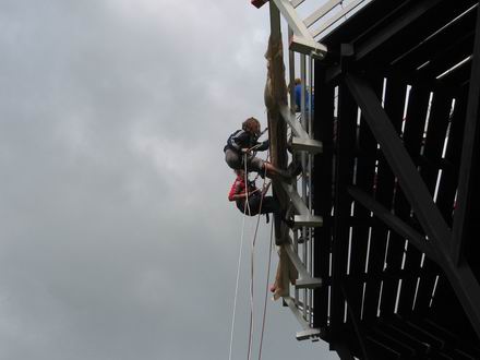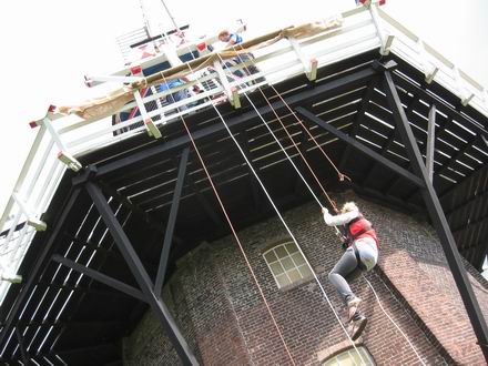 Een heel bijzonder afscheid van het schooljaar 2010-2011 voor de kinderen van groep 4 t/m 8 van CBS ’t Kompas in Noordhorn. Als compensatie van de in het water gevallen sportdag gingen de meisjes en de jongens “abseilen” vanaf molen “De Fortuin“. Amateurfotograaf Frans van der Veen stond erbij en keek ernaar: