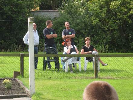 Enkele ouders, een bezorgde opa en een paar groenmedewerkers van de gemeente Zuidhorn slaan het spektakel gade. "As dit mor goud komt...."
