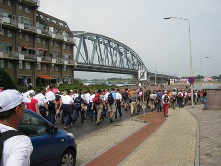 Een uitvoerig verslag van mijn belevenissen tijdens de Nijmeegse Vierdaagse 2011 is te vinden op www.jeebeetjes.nl. Bovenstaand een foto die werd gemaakt tijdens de stagnerende doorgang op de 2e dag in het centrum van Wijchen. Hieronder een foto, gemaakt in de eindfase van de 2e dag, de laatste loodjes, o.a. langs de Waalkade.