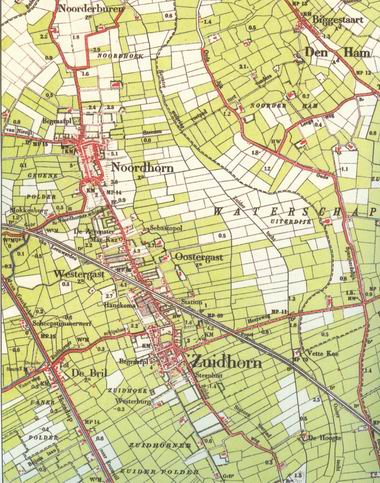 De Rijksstraatweg (N 355) ontbreekt natuurlijk, evenals het Van Starkenborghkanaal! Daardoor vormen Noordhorn en Zuidhorn een duidelijker eenheid dan nu het geval is. Je ziet bij Noordhorn de begraafplaats expliciet vermeld (nieuw toen in 1905?), evenals de Noordhorner schipsloot, Mokkenburg en Groene Polder. Ten noorden van Noordhorn de namen `Noordhoek` en `Noorderburen`. Aan de oostkant de vermelding van een Steenen voetpad richting Den Ham (‘met vonders’….) De Spanjaardsdijk wordt bij de kruising met het voetpad Oude Dijk genoemd en verder naar het noorden is dat Hamster dijk…. Het voetpad passeert een water dat op de kaart wordt aangeduid als Hamster watering.