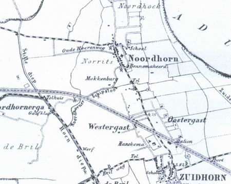Het dorp Noordhorn telt op dat moment twee molens, korenmolens! (Een op de huidige plek, de andere op de “Meulenbarg” achter de voormalige bakkerij van o.a. Menko van der Sluis). In verband met de oude foto zijn voor ons de oude watermolens van groter belang. Die staan er ook op. Eentje in de zuidoosthoek, gevormd door de Schipsloot en de spoorbaan; een tweede niet ver daar vandaan in de noordwesthoek, ook weer gevormd door de spoorbaan en de Schipsloot. Deze lag direct aan de oude weg die daar toen liep richting ‘de Bril’ en de Noordhornerga. Op het volgende fragment van de bovenstaande kaart is het wellicht duidelijker te zien: