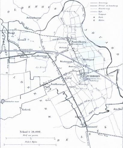 Nog even voortbordurend op de twee vorige blogs, die met de oude Van-Til-foto (water en watermolen), concentreren we ons op het gebied ten westen, zuidwesten van Noordhorn. In “Gisteren voor de lens” (Uitg. Profiel, Bedum, november 1983) staat op pagina 166 een kaart van de toenmalige gemeente Zuidhorn. De kaart is afkomstig uit de zogenaamde Gemeenteatlas van 1867. De spoorlijn is er al, de Rijksstraatweg loopt door de dorpskernen heen. In de toegevoegde tekst staat niet voor niets: “Let op de vele molens en tolhekken.”