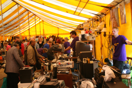Merkwaardig…. OPEN MONUMENTENDAG laat ik al jaren vrijwel onopvallend aan me voorbijgaan, maar de rommelmarkt achter en in de Wegwijzer, het verenigingsgebouw van de Hervormde Kerk Noordhorn, trekt als een magneet! De rommelmarkt crew, in herkenbare shirts gestoken, organiseerde deze regionaal bekende 2e-hands-goederenmarkt voor de 25ste keer! Een gelukwens waard! En ook hiervoor steek ik mijn bewondering niet onder stoelen of banken: Wat een inzet! Wat een spullen! Wat een belangstelling! En de sfeer? Uitstekend! (Ondanks enige drassigheid in de supergrote tent). De weersomstandigheden bleken de hele dag uitermate gunstig, de bezoekers kwamen al vroeg opdagen en vooral ’s morgens bleef het een komen en gaan. Voor de organisatie van dit zilveren evenement een plezierende omstandigheid, voor de kerkgemeenschap financieel een fikse steun in de rug! (Neem ik aan….) Of ‘puutholder’ Jan Geertsema al uitgeteld is? Sfeerbeelden van een indrukwekkende activiteit, in twee afleveringen: