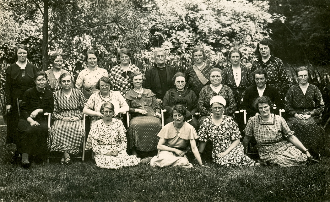 Goede, mevr.Dijkstra, mevr.Luth; Middelste rij: Mevr.Van der Sluis (de moeder van Aaltje Visser), onbekend, mevr.Van Wijk, mevr.Zoethoudt, mevr.Geut, mevr.Hoekstra, mevr.Stenekes, mevr.Knooihuizen; Onderste rij: Mevr.Hamstra, mevr.Hoiting, mevr.Hijszeler, mevr.Kooistra.