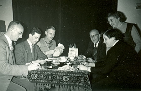 Een bestuursbijeenkomst van de v.v.Zuidhorn in de vijfitger jaren, vermoed ik. Links op de foto toenmalig puutholder Leendert Lodewegen; 3e van links: Jan Lijfering, secretaris, 4e van links Ru Weitering, voorzitter. Staande de echtgenote van Jan Lijfering. Wie de vrouw rechts is, weet ik niet en ook de naam van de man (2e van links) is mij niet bekend.