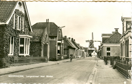 Verzamelaars van ansichten weten dat de Noordhorner Langestraat een van de meest gefotografeerde straten ter plaatse is. Een heel mooi voorbeeld vind ik deze foto uit het middengedeelte. Leeftijd? Als ik antwoord moet geven op zo’n vraag, verlies ik mijn evenwicht…. Meer dan vijftig jaar oud, dat klinkt geloofwaardig. Het huis links heeft al lang zijn begroeiing niet meer (klimop of wingerd?). De garage daarnaast, vroeger van huiseigenaar Homan er tegenover, later gebruikt door graan- en kunstmesthandelaar Wieringa, is er ook al lang niet meer. Daar bouwde Jan Wieringa (“Lange Jan” in de volksmond) een nieuw huis, inmiddels bewoond door de familie Arends. Het witte molenhuis is later van ‘zijn pleisters’ ontdaan en terug gerestaureerd, in oude nieuwe staat. Verdere veranderingen? Oei, dat wordt turen….. Ik denk dat verderop het huis van bakker Kadijk nog aanwezig is, waar nu de benzinepompen van Toyota-Pijpker staan. En links om de hoek staat waarachtig nog het oude huis van de familie Slagter… Of is dit gissen? Het meest opvallende? Geen enkele auto in dit gedeelte van de Langestraat, zelfs niet in de buurt van de garage! Of was Oosterhuis toen nog niet begonnen met zijn nering aan de westkant van deze voormalige Hoofdstraat? En die fietsers? Ik herken ze niet… Of is de voorste toch een Visser-dochter gevraagd door de fotograaf? Dat gebeurde wel eens bij opnamen voor prentbriefkaarten!