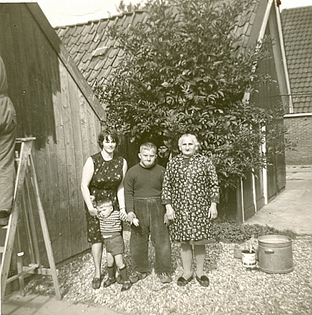 Een jonge Tineke van der Veen-Pijpker met zoontje Frans, haar zwager Frans en haar schoonmoeder, Sips moeder, 'oma Van der Veen'. Met onbekende verver links...