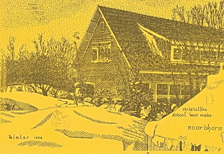 Tekening van de winterse situatie bij de Chr.MAVO aan de Langestraat, in 1979.