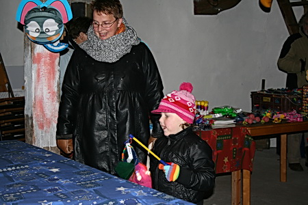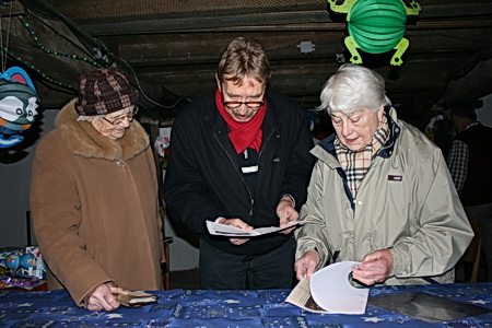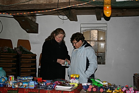 Twee stille Dorpsbelangenwerkers op de achtergrond, de dames De Boer en Dijck, bekijken nog even de diversiteit aan beloningen voor lampion en zang
