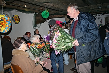 En ook vrijwillig molenaar Klaas Hekker zegt het met bloemen. Ook hij doet al 25 jaar mee aan de organisatie en wordt even later zelf verrast, met bloemen!