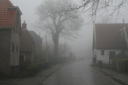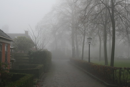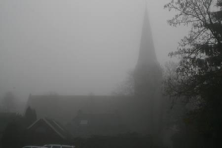 Ook als je de Torenstraat afkijkt, wordt het steeds mistiger. De pastorie en de Wegwijzer liggen haast verborgen onder een grauwsluier...