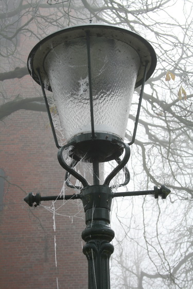Hé, kijk, het is nauwelijks vorstvrij.... Zilveren randjes rond spinnenwebdraden? Mooi, deze Kerstlantaarn, al ligt Kerst nog verborgen achter mijter en mantel van de Goedheiligman...