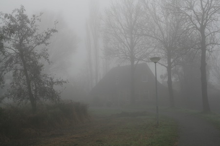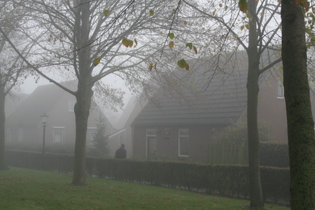 Nee, een liefhebber van (dichte) mist ben ik bepaald niet…. Vieze kou in deze tijd van het jaar en vaak aanleiding tot enige benauwdheid, niet prettig, noch comfortabel. Bij de pakken neerzitten? Geen sprake van! De uitdaging blijven zoeken, ook met het fototoestel. Erop uit met de Canon, kom mee, we maken een intens grijze trip door het dorp!