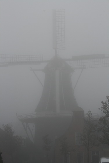 Koren- en pelmolen "Fortuna" lijkt verstoppertje te willen spelen; toch maakt dit monument ook in de mist een onuitwisbare indruk. Markant dorpspunt!