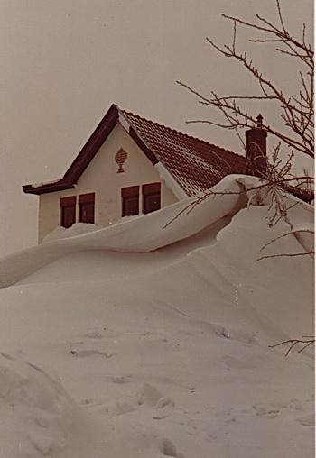 “Ik las in ‘Noordhorn Toen’ dat je niet meer wist wanneer de jachtsneeuw ons dorp teisterde. De juiste data zijn dinsdag 13 februari tot en met donderdag 15 februari 1979. Er stond een zeer harde oostenwind die af en toe opliep tot orkaankracht (windkracht 11) Ik ontleen mijn wijsheid aan het ‘Sneeuwboek‘ van uitgeverij Scholma in Bedum. Ons huis aan de Oosterweg 20 was toen in aanbouw en er zat nog geen glas in. De hele woonkamer was ondergesneeuwd. Er lag een manshoge laag sneeuw. Toen het weer wat rustiger was geworden heb ik, samen met Kees van Dijk (de concierge van onze school), de hele kamer leeggeschept en aangeveegd. Een hele klus kan ik je zeggen. Wij woonden toen nog in Zuidhorn en ik herinner me nog levendig hoe we in Noordhorn zijn gaan kijken naar al die ingesneeuwde huizen aan het begin van het dorp. En ook al die mensen die met sleetjes boodschappen deden.