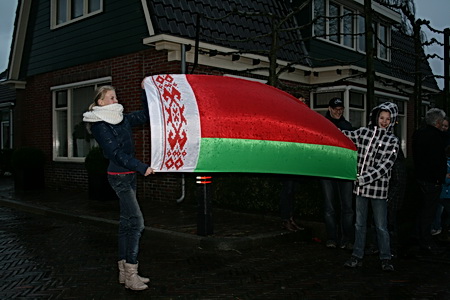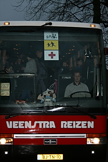 Uiteindelijk werd het toch zo rond de klok van negen dat de bekende rode Veenstra-touringcar opdoemde aan de zuidkant van de Oosterweg. Toen stond inmiddels een grote schare ouders, kinderen en andere belangstellenden bij de oprit van het verenigingsgebouw “De Wegwijzer” om de jonge gasten en hun begeleiders uit Wit-Rusland een warm welkom te heten! De spandoeken en het zichtbare en hoorbare enthousiasme van het thuisfront zorgden voor een gezellige sfeer tussen NH-Kerk en pastorie, iets waar de weersomstandigheden in mindere mate aan bijdroegen. Alhoewel, eerder die morgen was het natter en guurder, het viel dus eigenlijk ook nog weer mee. Een bijzonder hartelijk onthaal dus en dat gold ook voor de Stichting Tsjernobyl vertegenwoordigers als Margriet Matter, Angela Stenekes, Greetje Steenbergen, Martje Heemstra en Fokje Kooistra (Ik mis er nog een, kom…hoe heet ze…Een Van-Gosliga-dochter….Maria Rozema, bedankt buurtjes!). Vermoeid en toch niet stuk te krijgen….. Gauw naar binnen, naar de warmte van de grote Wegwijzer-ontvangstruimte, waar Herman Scholte een goede gastheer was, koffie schonk en een gebed uitsprak, bovendien enveloppen uitdeelde. De goede gang van zaken, een mix van ontspanning en voortgang, werd evenzeer bewerkstelligd door werkgroepleden als Arina, Annemiek, Margriet… Het uitgekiende draaiboek functioneerde uitstekend! Geen lange toespraken, accent op de kinderen en hun gastouders, waarbij aan elk kind voldoende aandacht werd besteed. Jammer, één jongetje kon op het laatste moment de reis niet meemaken, moest afhaken door een gebroken arm. Voor het overige: de 31 kinderen uit het zuiden van Wit-Rusland, waar de kwalijke gevolgen van de kerncentraleramp (1986) nog steeds merkbaar zijn, gaan zeven drukke, maar gezellige weken tegemoet binnen bijzonder betrokken gastgezinnen én op de gastvrije Geref.Basisschool “De Brug”, waar een lokaliteit beschikbaar is voor de groep uit Belarus. En hoe was die Russische welkomstgroet nou ook al weer??? “Dobre outre”???? (Goed bedoeld, ex-schoolmeester, genoeg geklungeld, hou je nou maar bij je leest en laat wat foto’s zien!):