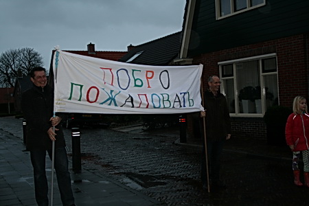 Nog een spandoeK! Of ze het doek goed houden, of achterstevoren... Ik ben een leek op Russisch gebied. Déze gastvaders kennen hun vreemde talen!