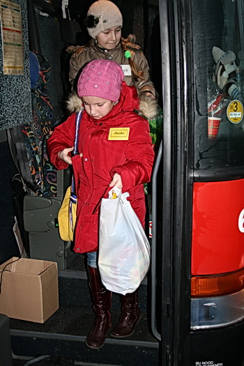 Na de werkgroepleden komen de Belaruskinderen naar buiten, Liza als eerste, bepakt en bezakt! Enthousiast worden ze begroet!