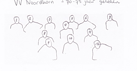 Leendert Meijer, ooit zelf enige tijd voetballer bij v.v.Noordhorn eind jaren veertig, heeft Tjeerd de Boer gevraagd om eens te rade te gaan bij good-old Kees de Haan (Lindestraat, oud-keeper). Leendert komt zelf vanwege gezondheidsredenen de deur niet uit, vandaar. (Tjeerd de Boer maakte ook de elftalschets met nummers). Nee, niet alle namen kwamen boven water, maar wel een aantal mogelijkheden: