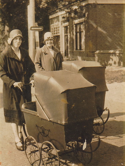 Eind jaren twintig, twee dames achter de kinderwagen, prachtig tijdsbeeld en kwalitatief een goede foto!