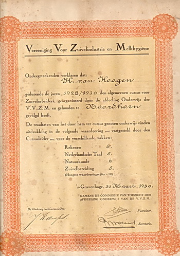 Zuiveldiploma, door Hendrik van Hoogen behaald in 1930, na het volgen van "den algemeenen cursus voor Zuivelarbeiders"