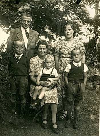 Dat binnen mien ome Job en taande Oaltje Visser-van der Sluis, mit hun zeuns, mien neven Anne (de olste, stoand links) Piet en op schoot Ningo. Dei jonge vraauw dei kin ik nait. Mor de foto is wel van veur mien tied.