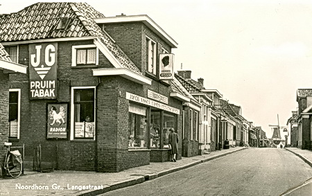 “Noordhorn Toen” op de achterkant van het maandelijkse “Noordhorn Nu”, heeft faam opgebouwd, goodwill gekweekt. Wat voor foto zal ik kiezen? Komt elke Noordhornkant voldoende aan bod? Vergeet ik het noorden niet, blijft het oosten niet onderbelicht, hou ik het actuele van het zuiden in de gaten??? En de westkant, wat is daarover te melden? Nog maar eens het centrum….. De Langestraat, in de vijftiger jaren florerend middengedeelte met een prominente plek voor Jakob Vissers kapsalon, zowel voor Dames als voor Heeren. Bovendien, adverteerders willen graag plaatsruimte op de achterkant en adverteerders komen zó nadrukkelijk in beeld. De kapperszaak als aanplakzuil, het is maar goed dat het een zwart-wit foto is…. Hoe oud deze ansichtkaart is? Dat is aan de spelling van het woord “Heeren” niet af te lezen, die naamgeving staat er al vanaf de jaren dertig, toen Jakob het knippen als onderneming overnam van zijn vader. Andere tijden, andere spelling…. Prachtig die lichtbak aan de dakkapel, ook in het donker geen twijfel mogelijk: Hier moet je zijn wil je er goed verzorgd bij lopen… Op de voorgevel ook reclame voor het sigarettenmerk “North State”! In mijn jonge jaren een populaire sigaret, concurrerend met Roxy en later Caballero. Geel, slap pakje, daar waren Golden Fiction en Miss Blanche deftige kartonnen verschijningen bij….. Achter het zijvenster aan de noordkant een scheefhangend affiche. Ik kan niet goed lezen wat er op staat. Of heeft de kapper dat raambiljet een duwtje gegeven om te kunnen zien wat de fotograaf doet? Met koeienletters worden we opmerkzaam gemaakt op het bestaan van J.G. pruimtabak…. Zijn de pruimers intussen uitgestorven? En in het lijstwerk aan diezelfde muur een beschaafde RADION-boodschap, “wast stukken witter”! In die jaren nog twee etalages waarvoor de dame in mantel belangstelling toont. Of kan ze zo spiegelbeeldig bekijken hoe de fotograaf haar op de korrel neemt? Naast Vissers salon het oude, stijlvolle pand van de familie Spoelma (geen Spoelman!), later gemoderniseerd (door Schuiling?) en nu door het leven gaand als kapsalon Noordhorn! Het kan verkeren! Fraai te zien, het hoogteverschil waarvan tegenwoordig, verderop, gebruik wordt gemaakt door zeepkisten, eens per jaar. Auto’s? Nergens te bekennen! Wel fietsen, en een karakteristieke straatlantaren. Iets verderop reclame voor Butagas, van koperslager De Boer?. Neringdoend Noordhorn, toén! (JB)