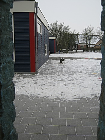 Vanaf de kop van de Meidoornstraat, ter hoogte van Jan Geertsema's buitenverblijf, kun je door enkele muurgaten koekeloeren over het plein van 't Kompas. Nee, geen hanggroep deze keer. Hebben ze hun sur-place-activiteiten verplaatst naar het ijs???
