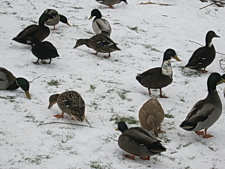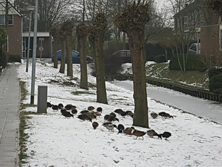 Een begaanbaar tegelpad langs de Borgwegwoningen, een besneeuwde berm met geknotte bomen, een gracht met dikke ijsvloer. De eenden worden bijgevoerd, ze laten 'het' zich goed smaken!