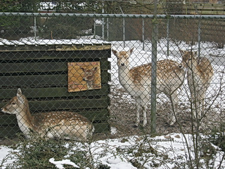 De damherten in de hertenkamp hebben beschutting gezocht achter de mestbak. Het bord op de bak geeft het duidelijk aan: Wel schillen, geen plastic!