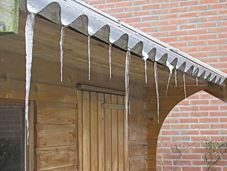 Slotakkoord! De ijspegels die harmonieus hangen aan het golfplatendak van het houten schuurtje van de overburen. Smeltend seizoen, koudegolfuitroeptekens....