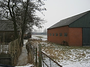 Rechts de schapen/paardenschuur van Jakob Tempel, op de verre achtergrond de woonplek van Jakob en Tina Stenekes