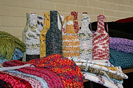En Gretha ("Nee, ik niet op de foto...") is creatief met breinaalden en wol, fraaie maatpakken voor flessen bijvoorbeeld