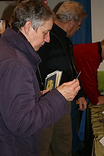 De kleine zaal is deze keer ook benut met o.a. deze bekende Noordhorner gezichten. Op de tafel een diversiteit aan dingetjes met in het midden.....Mmmmmmmmmm!