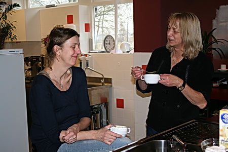 Tot slot twee van die energieke achter-de-schermen-medewerkers, Anyk en Anneke, de erwtensoep keurend! (Zeg niet: "Is de snert snèrt...") In hen eren we al die Dorpsbelangenmensen die activiteiten als deze markt 'op poten zetten'. Vrijwilligers tegen wie je als dorpsbewoner best wel eens "U" mag zeggen! (Figuurlijk dan.... Overigens, wellicht ten overvloede opgemerkt: de gelaatsuitdrukkingen verklappen niets over de kwaliteit van het gebodene, meer de aversie tegen het nemen van foto's.....)