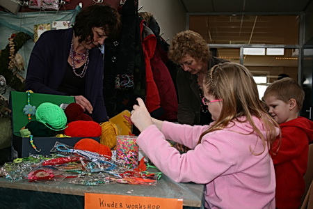 Een natuurlijk ogende stand in de hal van het dorpshuis, met een workshophoek voor de kinderen. Iets creatiefs doen, dat willen kinderen wel!