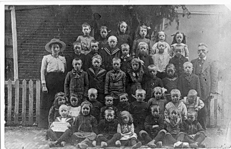 Op deze oude groepsfoto die Theo van Hoogen me toestuurde (bron???), zou meester Kamps moeten staan, de manspersoon rechts neem ik aan. Een foto van ruim 100 jaar vermoed ik.... Zouden de namen van de kinderen en volwassenen bekend zijn?