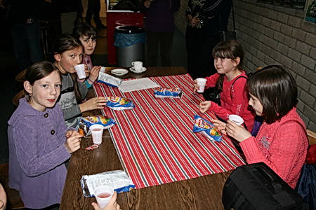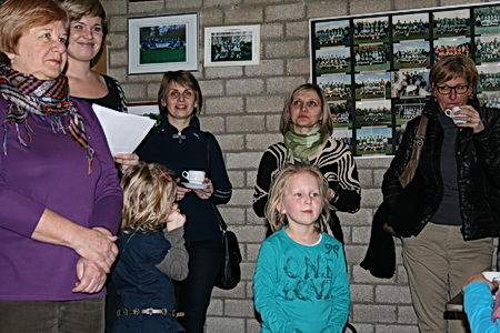 Een hoog damesgehalte bij deze interland! Van links naar rechts de geweldige tolk, Angela Stenekes, beide enthousiaste leerkrachten uit Reichytsa en moeder Heemstra aan de koffie. Wie die jonge talenten op de voorgrond zijn?