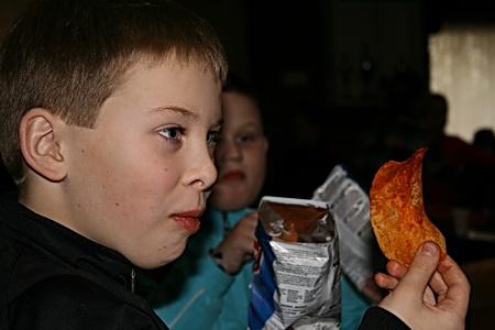 Het mooie van die paprikachips is dat ze zo'n prachtig oranje randje geven, aan monden bijvoorbeeld. Verborgen Oranjesupport!