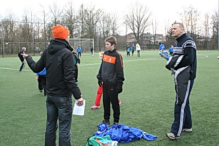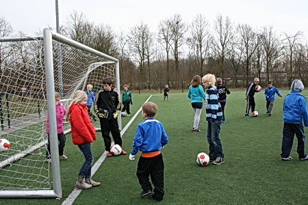 Vanwege de tamelijk lage buitentemperatuur heeft de coach besloten zo compact mogelijk te spelen: "Blijf dicht bij elkaar, dat is het warmst!" Kluitjevoetbal, maar toch anders....
