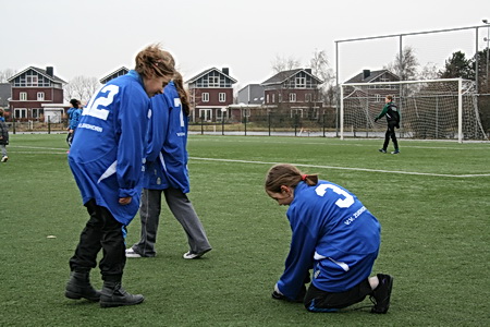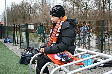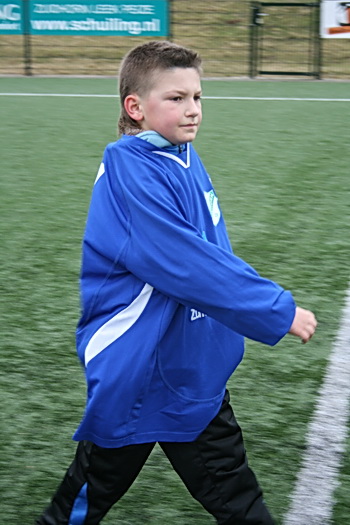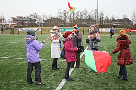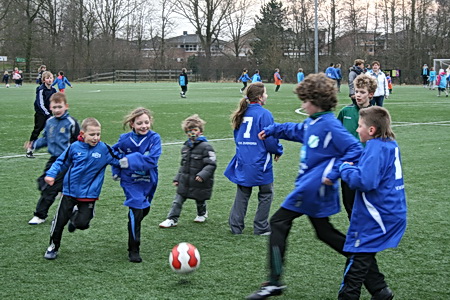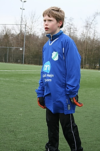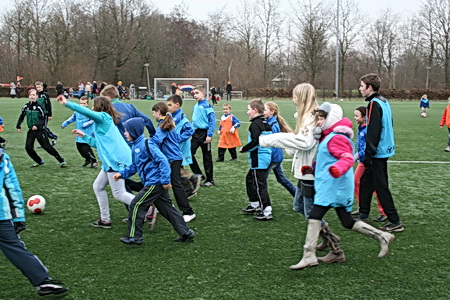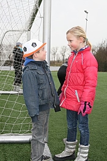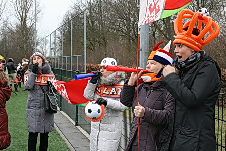 Van de warme atmosfeer in de kantine naar de februarifrisse lucht op het winderige kunstgrasveld, het is even wennen... Maar wie maalt daar uiteindelijk om, het zonnetje komt zelfs heel voorzichtig nog even te voorschijn! Eerst maar even inspelen.... O, bal tegen een hoofd, onverwachts. Even een traantje wegpinken, en doorgaan!