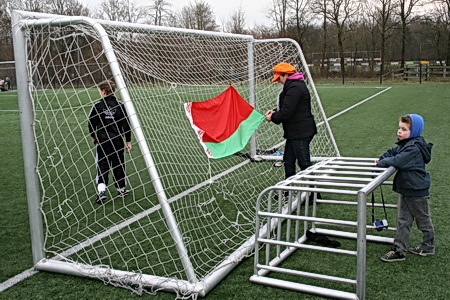 Tijdens de laatste poulewedstrijd wordt de Wit-Russische vlag nog even welwillend achter het doel bevestigd door een Oranjesupporter. Wederzijdse hoffelijkheid, ten voorbeeld!