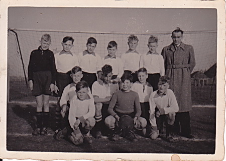 Dan gaat de deurbel, staat Piet Timmer (zoon van leider Henk Timmer; JB) op de stoep, met geel krantje + namen! Piet weet dat links in de staande rij Geert Spoelman als doelman poseert. Maar naast hem? Vraagteken….Harms? De derde vanaf links is trouwens good-old Harrie Kuipers (zijn ouders woonden aan de Noorderweg, Harrie trouwde later met Anneke van der Leij, het gezin woonde aan de Nieuwstraat, ging later naar Zuidhorn). Naast hem staat Jelte Giesen (ouders beheerden het café-restaurant aan de Langestraat, later Miedema). Vervolgens Follie Bijma (de broer van Pier, en Harko?). En dan? Een Kazemier? Maar welke? Links van de keeper vooraan zit Sjoerd Giesen, broer van Jelte. Rechts van de doelman Roelf Spoelman, broer van Geert. Nog een vraagteken in de middelste rij, rechts. Zou het Lukas Dijck kunnen zijn, broer van Hille? De oogst valt danig mee, met dank aan de verstrekkers! Meer informatie? Graag!