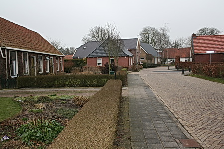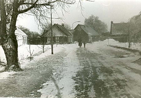 Terug naar de Moeshornfoto… De oude boom links is denk ik gesneuveld in verband met de komst van de Esdoornstraat, bebouwing aan beide kanten. Het Hummel-Helmus-huis kennen we, nú. Toén leefde Maarten Hummel nog, evenals ‘vrouw Van der Veen’ ernaast. Wie woonde er toen in het huis dat nu Engbert en Iektje Bergman onderdak verschaft? Hendrik Dijkstra? Derk? (Soms bezorgt de ‘hogere’ Noordhorner namenkennis me hoofdbrekens…) Het huis van Bakker staat er nog, inmiddels gesloopt en vervangen. Er achter het grote landhuis waaraan Tjaard Renkema ooit begon, zwembad in de achtertuin. En rechts, met de bult sneeuw, Meijers ligusterheg. Of was het toen nog Veenstra’s huis en hof? Tussen heg en huis ligt trouwens de Noordwijkweg, op de foto onzichtbaar. De oude kastanje die vroeger Nutskleuters bescherming bood (ze konden hoogstens door een vallende kastanje in herfsttijd worden lastig gevallen…) is op de achtergrond wel duidelijk te zien. Wie de twee eenzame mensen, volwassene plus kind, op het begaanbare deel van de Moeshorn zijn? Onherkenbaar! Of….? Barre tijden, in Noordhorn Toén! (JB)