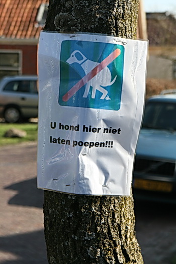 Ja, hierbij kan ik me iets voorstellen…. Jammer dat ‘U hond’ een -w- ontbeert… Nu lijkt het alsof de hond wordt aangesproken, terwijl het toch om de uitlaters gaat… (Bijkomend probleem: De suggestie dat het hiér niet mag, maar dáár wel….. Nee, dáár dus ook niet!) Stop, als dank voor het aangenaam verpozen, de hondendrollen in zakjes of in dozen….