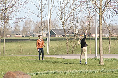 Hé, kijk, twee jongelingen die al spelend afscheid nemen van de winter, de lentekriebels nopen tot sportieve daden! Jammer, de wind is spelbreker. Het veren hoedje vliegt alle kanten op, behalve de gewenste….